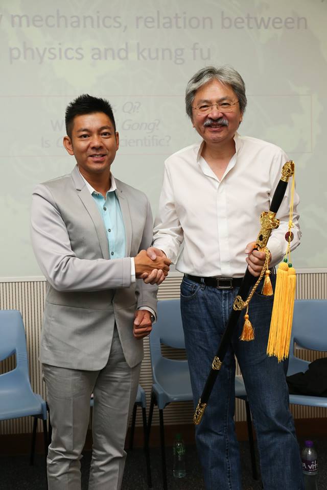 從來寶劍是贈英雄,所以我將這把握寶劍送贈給我邀請來的主禮嘉賓曾俊華先生,一位我非常尊敬的人物!It was my great honor to invite the Honourable Mr. John Tsang (曾俊華先生) again as the officiating guest of the second Kung Fu seminar (中華武術的古與今 - 功夫與現代科學, organized by Imagio Image Consulting Co. The seminar was held at the City University of Hong Kong on 8/26/2017 with a great success!